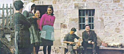 A la entrada de la casa de Conchita. Maximina a la izquierda de la foto y Conchita en el centro. Joey Lomangino escucha la conversación sentado en el banco. Cetuco, hermano de Conchita, hace unas albarcas(madreñas).