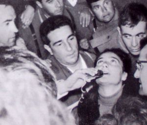 Conchita, en el centro de la foto, poco después de caer en éxtasis. Las dos cámaras se ven en la parte izquierda; uno de los guardias civiles ya empieza a quitarse el tricornio. Conchita recibe de San Miguel Arcángel el segundo Mensaje.