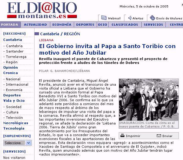 El presidente de Cantabria, Miguel Ángel Revilla, anunció en el transcurso de una visita oficial a Liébana que el Gobierno ha cursado una invitación formal al Papa Benedicto XVI a Santo Toribio con motivo del Año Jubilar 2006.