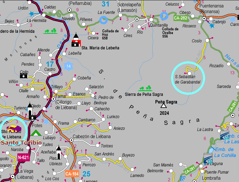 Santo Toribio, abajo a la izquierda, y Garabandal, arriba a la derecha, están muy cerca, separados por la Sierra de Peña Sagra.