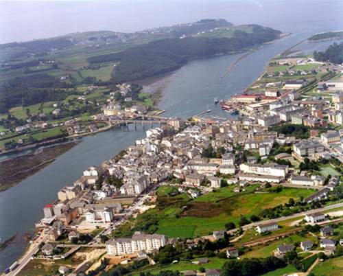 La villa de Navia, a la derecha de la foto, y el pueblo vecino de El Espín (Coaña), en el margen izquierdo de la ría de Navia. En la lejanía, arriba de la foto, se ve el mar Cantábrico y, arriba a la izquierda, los pueblos de Foxos, Mohías y Ortiguera.