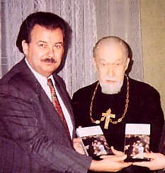 Foto: Yuri Shymko y cardenal Lubachivsky con el video "El Mensaje de Garabandal" en la mano.